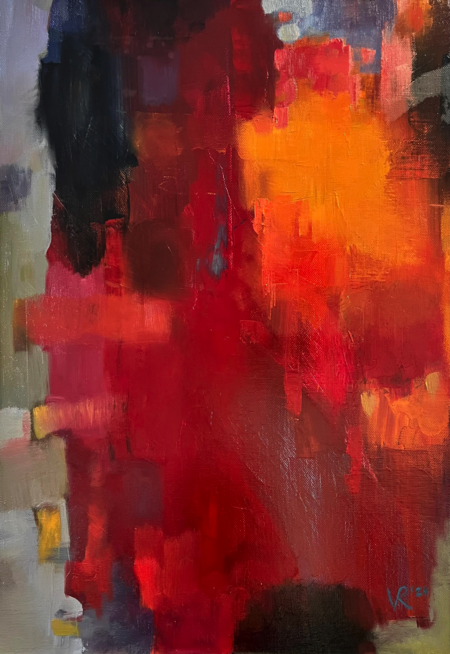 Картина взрывается цветом и энергией, воплощая хаос в ярких, абстрактных формах. Это вихрь красок, где нет ни начала, ни конца, только непрерывное движение и взаимодействие оттенков. Доминируют насыщенные, почти кричащие цвета: ярко-красный, оранжевый, контрастный черный — они наложены друг на друга без видимого порядка, смешиваясь и перетекая, создавая эффект взрыва эмоций.