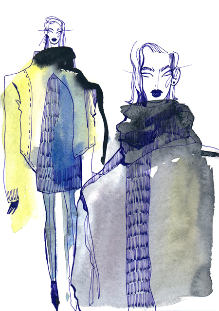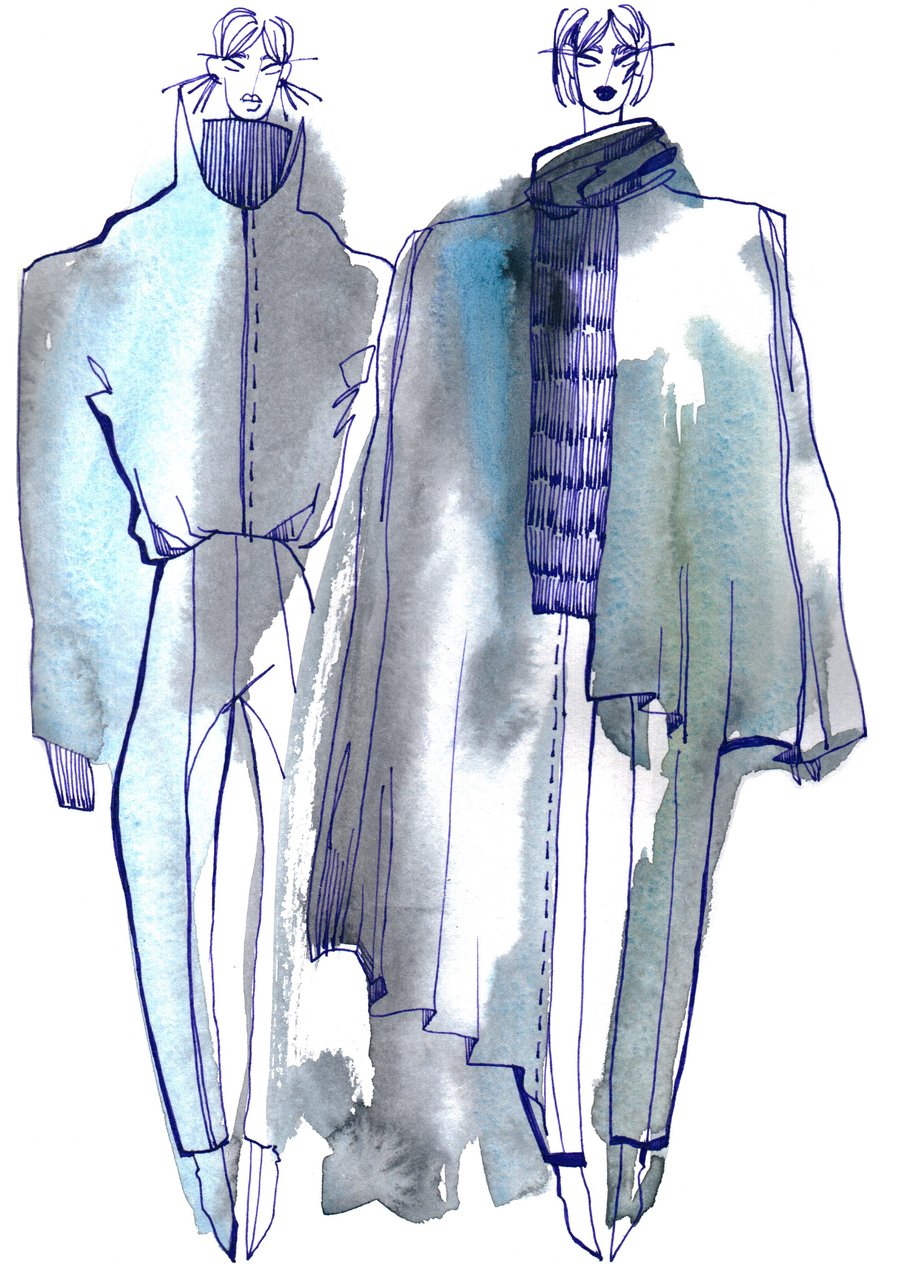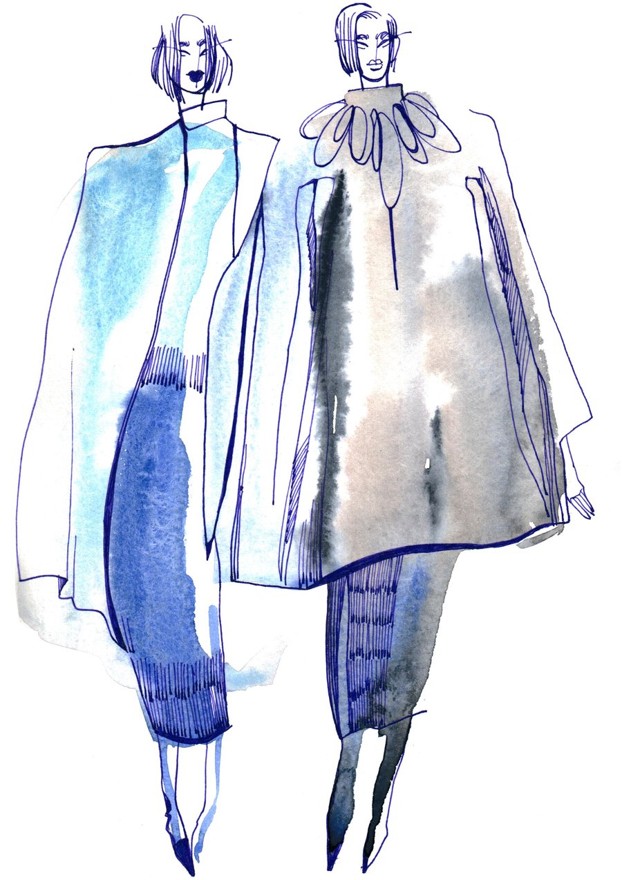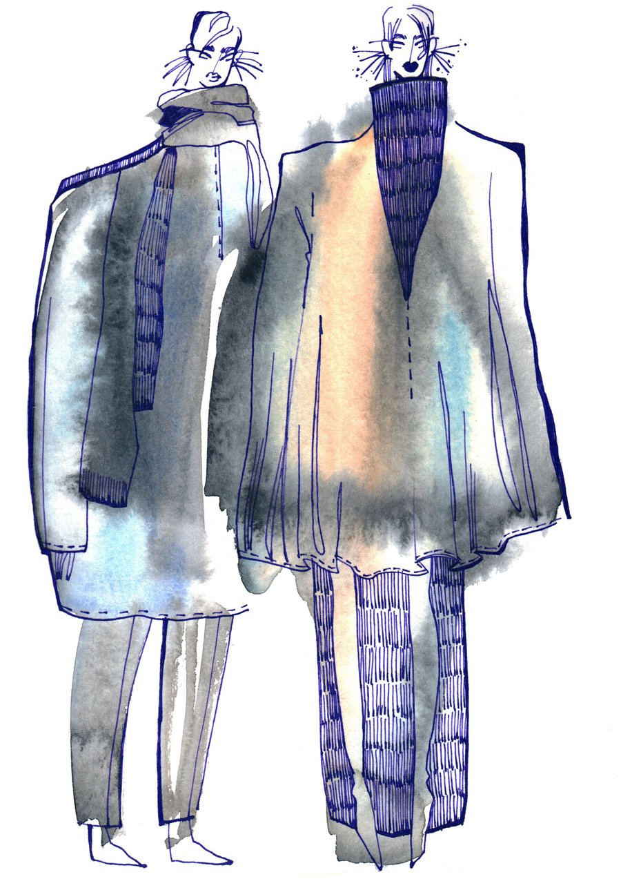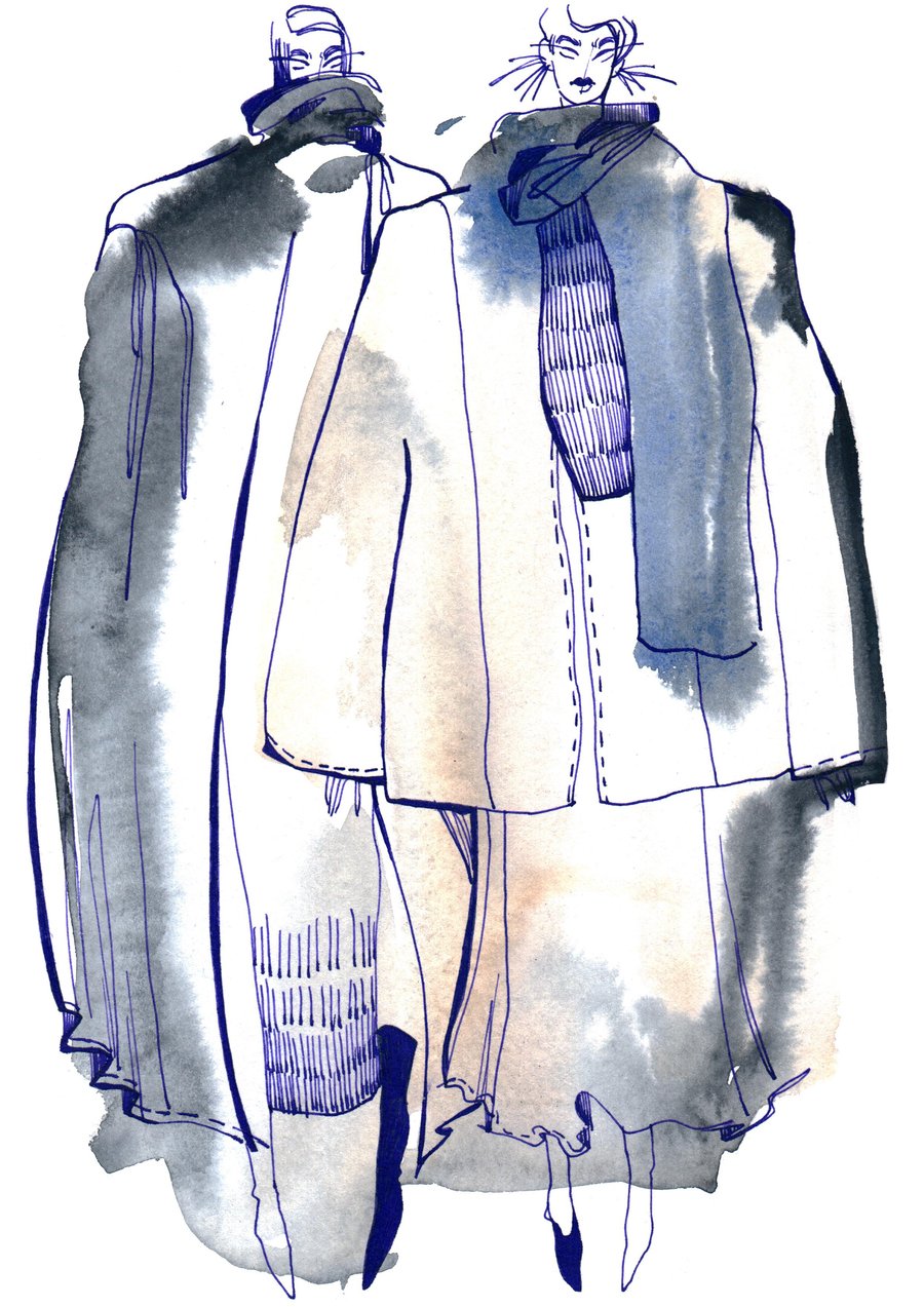 Силуэты пальто, плащей и накидок рождаются из воздушных размывок акварели, создавая ощущение лёгкой дымки и влажного ночного воздуха.