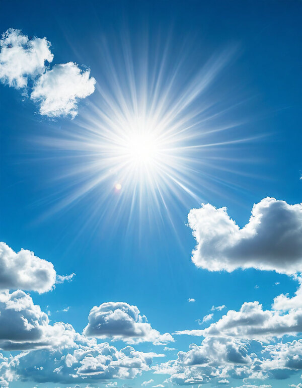 Промпт для Шедеврума: «Мне нужна картинка вертикального формата. На картинке изображено голубое небо, которое занимает пространство всего изображения. На небе видно несколько белых облачков, но их немного. Ярко светит солнце. Солнце с точки зрения композиции расположено в верней части изображения, справа от центра изображения. На изображении видны артефакты в виде солнечных лучей. На изображении нет никаких людей.»