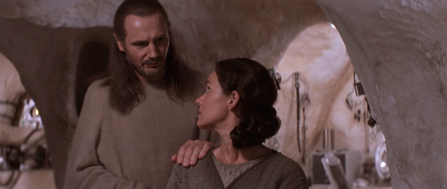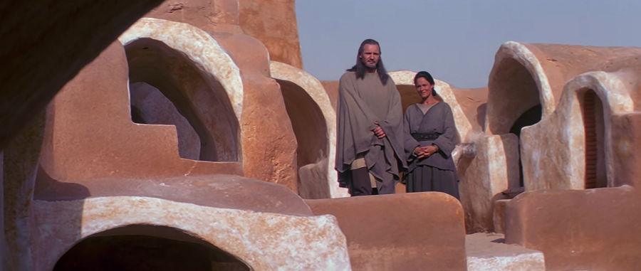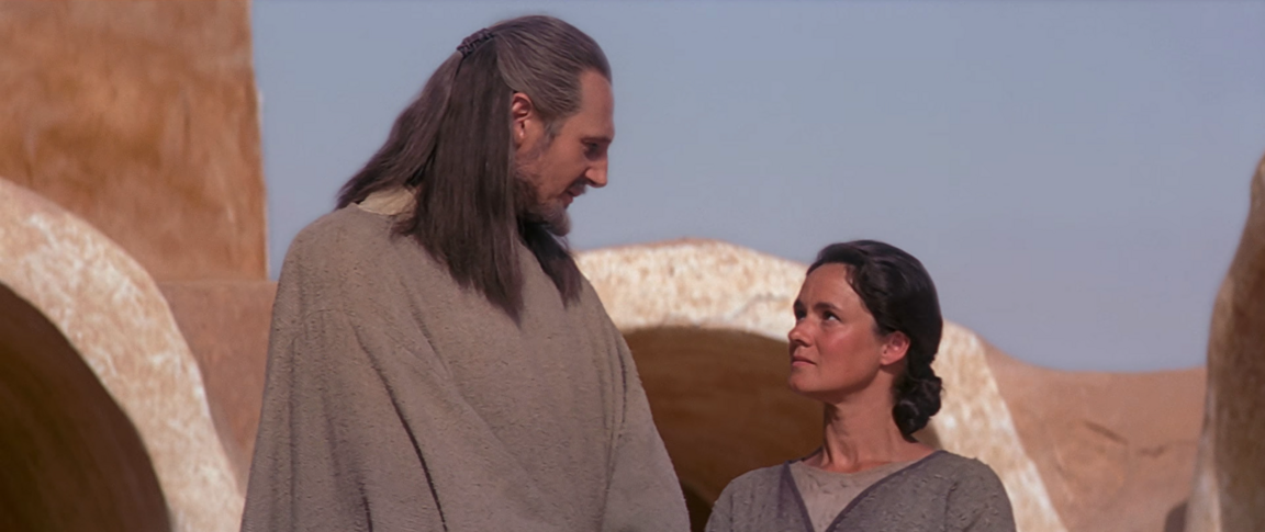 Кадры из «Звёздные Войны. Эпизод I: Скрытая угроза» (1999 г.). Персонажи: Квай-Гон Джинн (слева) и Шми Скайуокер (справа).