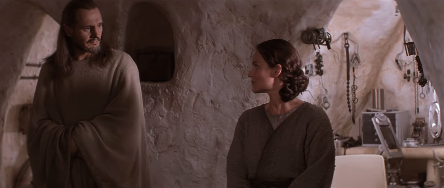 Появление Квай-Гон Джинна и его ученика, Оби-Вана Кеноби, на Татуине также (нарративно и визуально) сопоставимо с сюжетом поклонения волхвов. Функцией волхвов (жрецов, мудрецов и астрологов из восточных, что важно, так как отрицать вдохновение Дж. Лукаса философией и эстетикой востока невозможно, земель) являлась встреча спасителя, ознаменованная появлением Вифлеемской звезды, и передача ему даров — золота, ладана и смирны, указывающих на его роли (царь, бог и страдающий). То же самое, пусть и не в полной мере, делают Квай-Гон и Оби-Ван: пришедшие издалека, они распознают необычную судьбу (пророчество о Балансе Силе и «избранном») юного Энакина, видят в нем мессию и одаряют его освобождением из рабства, надеждой, а также будущей супругой (на кадре выше она — самая левая фигура).