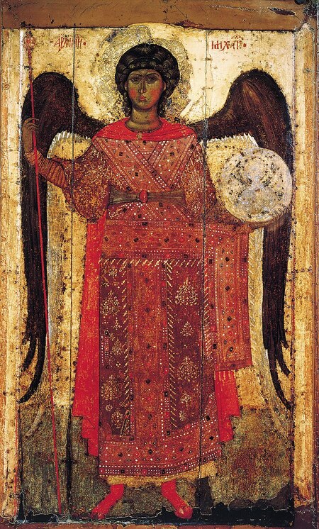 Кадр (на нём запечатлен Энакин Скайуокер в последние моменты до «начала падения») из «Звёздные Войны. Эпизод II: Атака клонов» (2002 г.) и икона Архангела Михаила (XIII век).