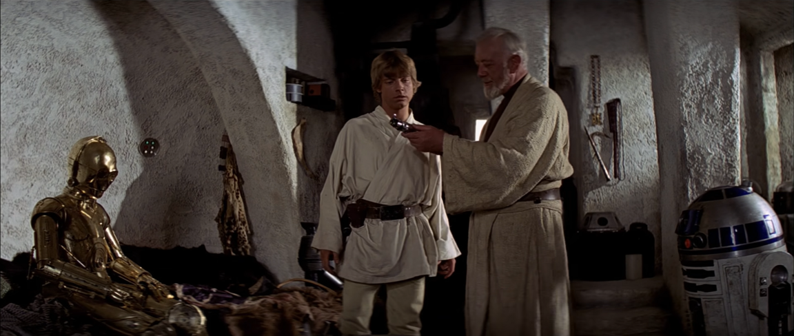 Это «начало пути» сопоставимо с сюжетом явления Христа народу. Облаченный в джедайскую робу, словно Иисус в хитоне и гиматии, Оби-Ван Кеноби передает Люка, будущую мессию, его ближайшим родственникам. Здесь джедай — и выходящий к людям Иисус, и нарекающий спасителя Иоанн Креститель (об этом — далее), вновь оказывающийся в пустынной территории, связанной с очищением, переходом и являющейся своеобразных пространствоим инициации.