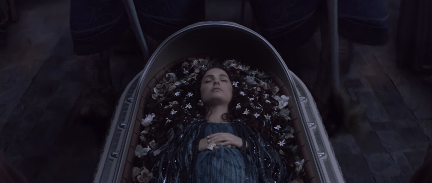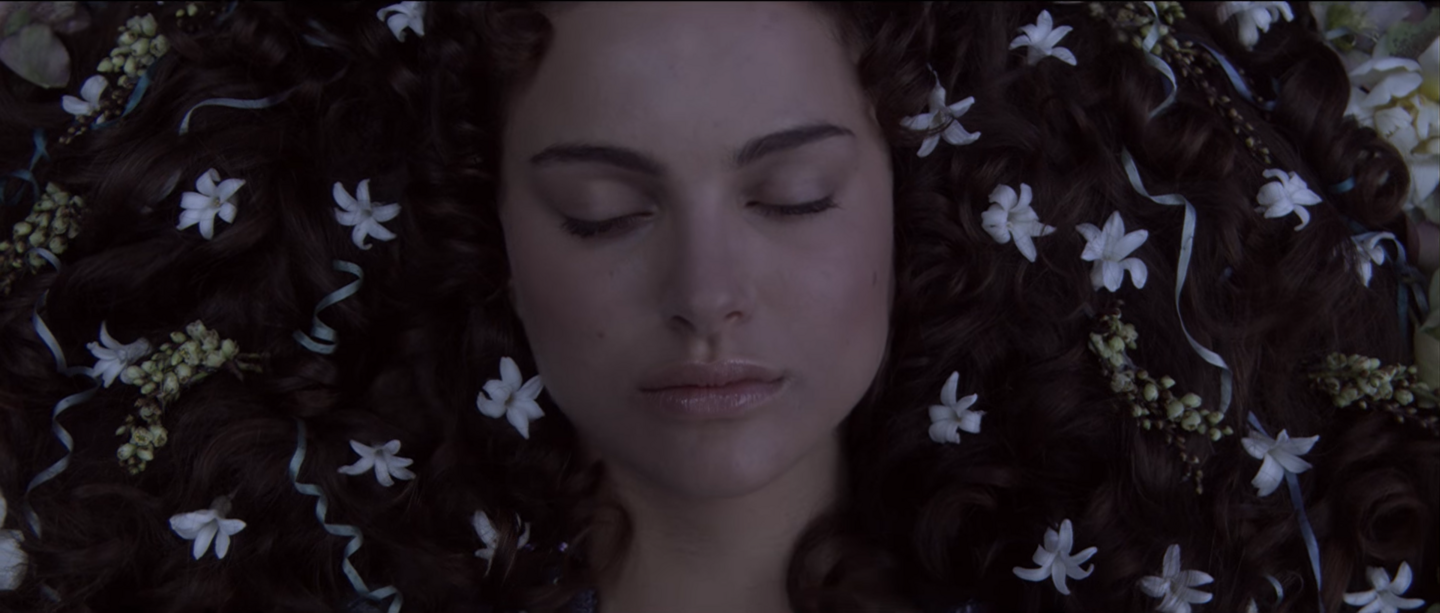 Кадры из «Звёздные Войны. Эпизод III: Месть ситхов» (2005 г.), на них — умершая Падме Амидала (Натали Портман) в окружении цветов, напоминающих белые лилии.