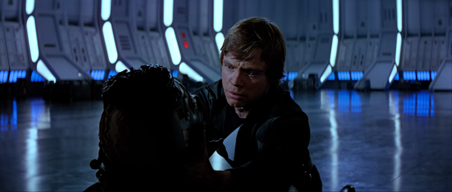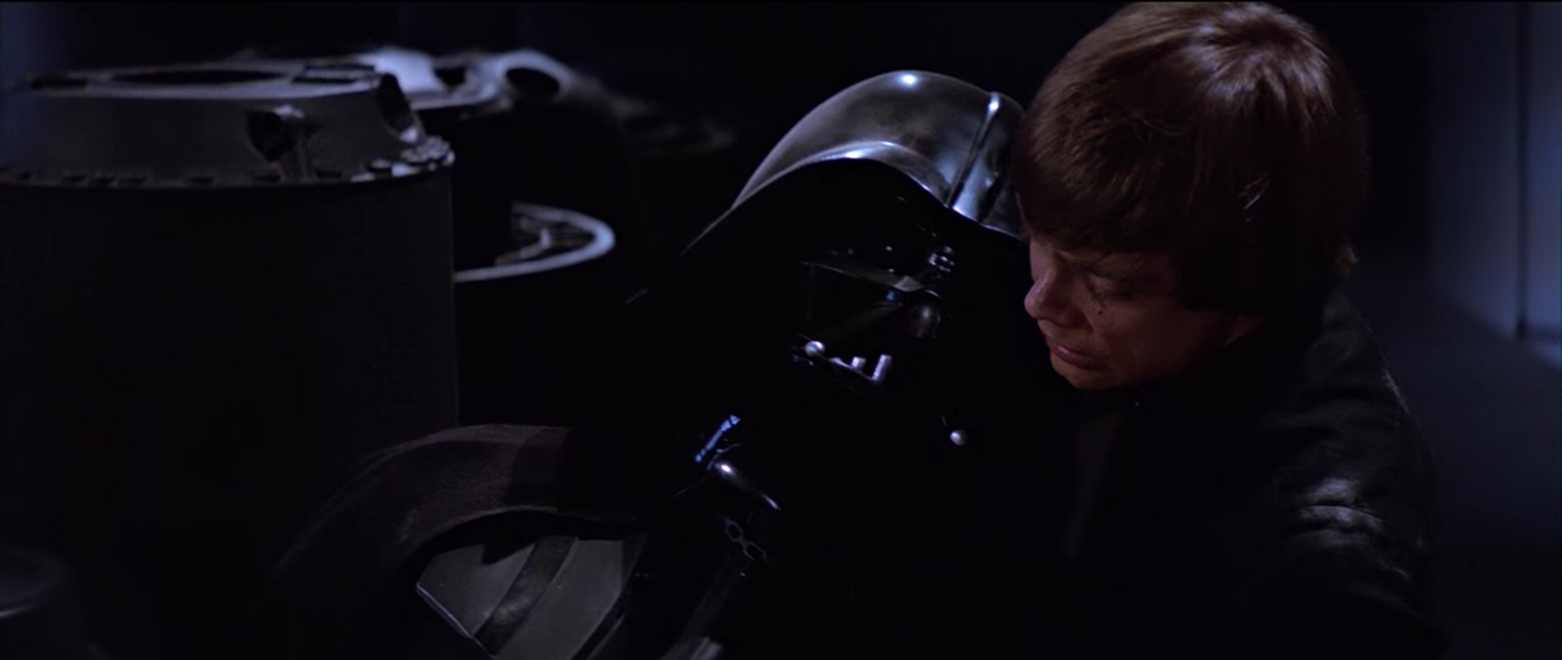 Уже упомянутый ранее сюжет оплакивания Иисуса Христа — вновь в «перевернутом» с точки зрения «классической трилогии» и в «прямом», если рассматривать сцену в контексте всей саги, виде — сопоставим с заключительным эпизодом пятой части киновселенной. Так, Люк Скайуокер прощает своего отца и прощается с ним тогда, когда наступает момент его, покаяния и избавления от мук.