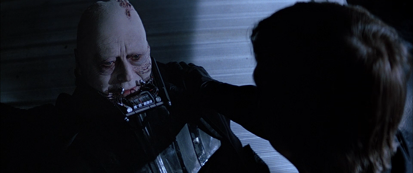 Фигура умирающего отца на руках у собственного сына вновь отсылает к пьете, пусть и не так буквально, как это происходило в сцене смерти Шми Скайуокер, но здесь куда более важно само лицо Энакина — бесстрастное, искаженное ранами, полученными от огня Мустафара, но не болью наступающей искупительной смерти, оно схоже со спокойным ликом Иисуса, лежащего в руках Марии.