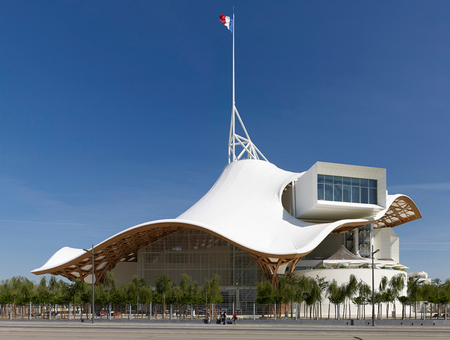 Конструкция павильона имитирует форму рыбы, что служит одновременно и декоративным, и функциональным элементом.