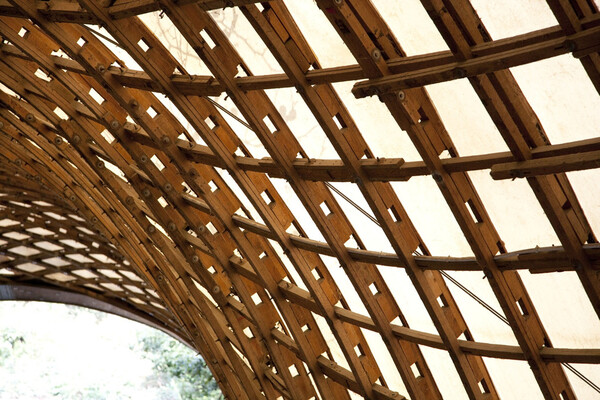 Сетчатая оболочка здания обеспечивает структурную прочность, а форма, напоминающая огурец, повышает аэродинамическую устойчивость, что позволяет минимизировать использование материалов и энергию.