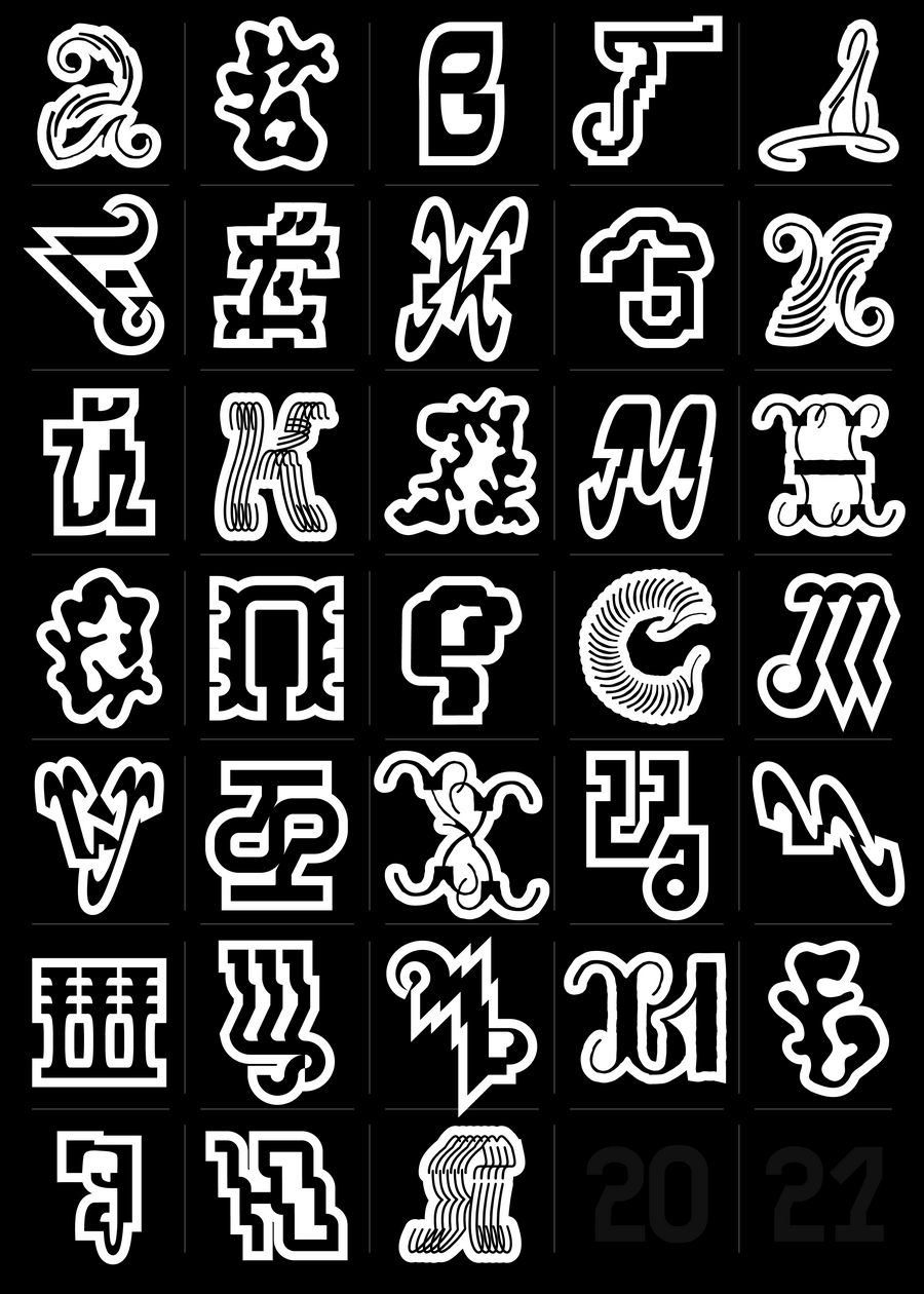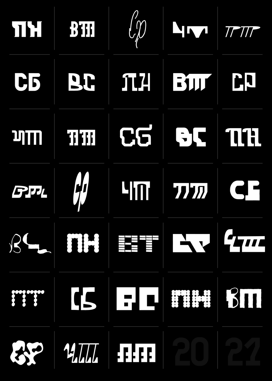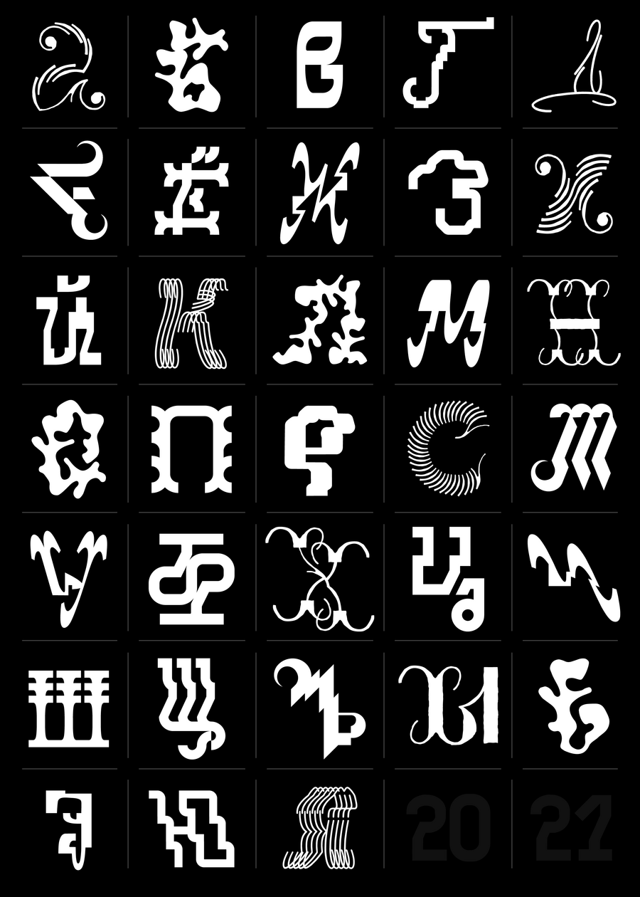 Unlike the previous concept of the letters BKVH 2024, this series of shapes turned out to be so diverse that I had doubts whether such diverse stories would look good next to each other. But in the end, together they create a unique silhouette: it looks very eclectic, which is very good — there is a chance to convey the versatility of the project and a special mood.