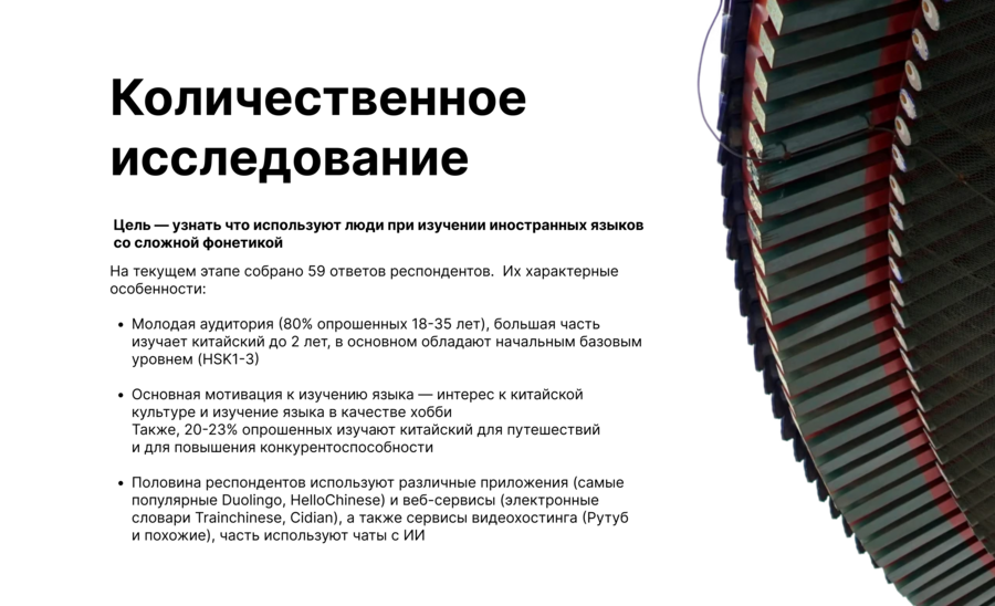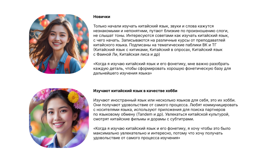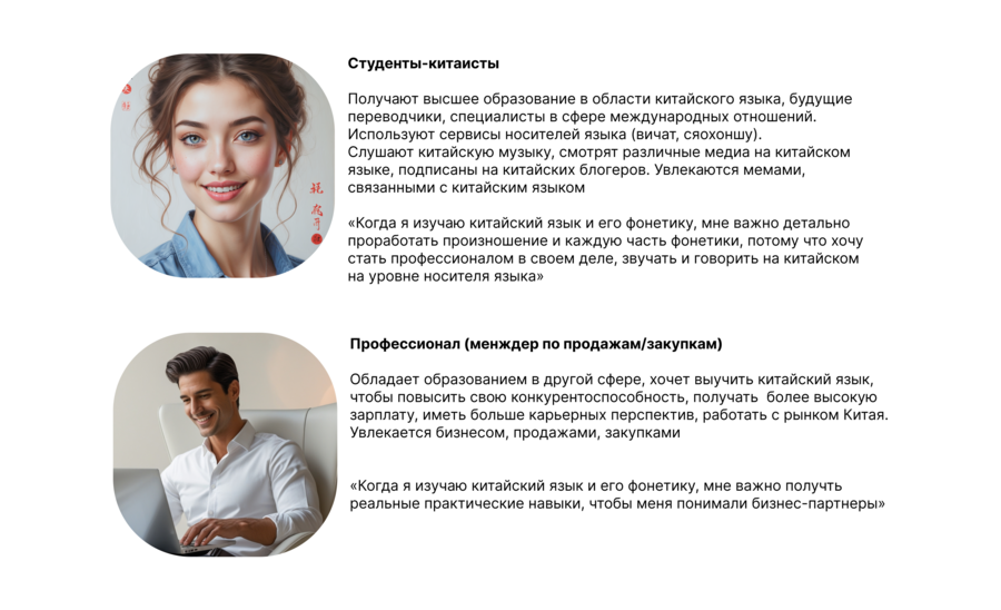 В приоритете сегмент для дальнейшего исследования — новички. Это наиболее многочисленная группа, которая больше всего сталкивается с трудностями в освоении тонов. Особенно важно на первом этапе усвоить правильные паттерны произношения, заложить базу для дальнейшего совершенствования произношения, а также избежать закрепления ошибок (исправить которые впоследствии будет гораздо труднее, чем выучить правильно).