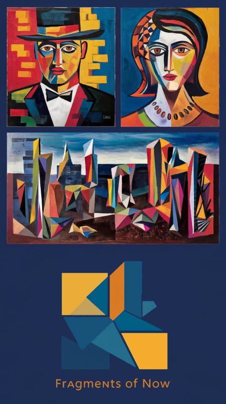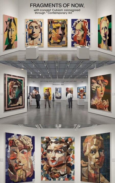 Prompt: come up with mockups for an art exhibition titled Fragments of Now. The concept is Cubism reimagined through contemporary art. Use the metaphor 'Mosaic of the 21st Century' — a new visual story built from classical fragments.