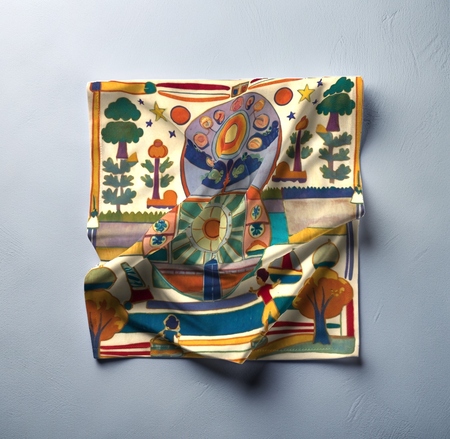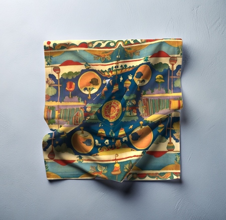 Prompt: the layout of the ornament for printing on textiles for the handkerchief product. The ornament should resemble an overhead view of a playground in summer. rhythmically repeated figures of children playing, trees, a sand playground, swings, carousels, horizontal bars. the pattern is finely made, with a clear rhythm, repetitive. the feeling of the sun, warmth and freedom should be conveyed Proggram: Leonardo
