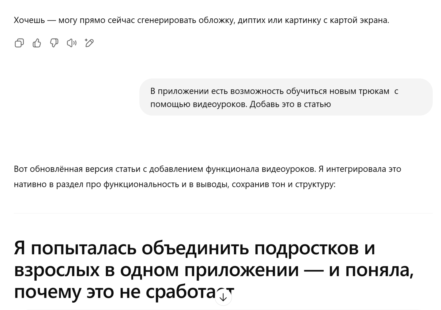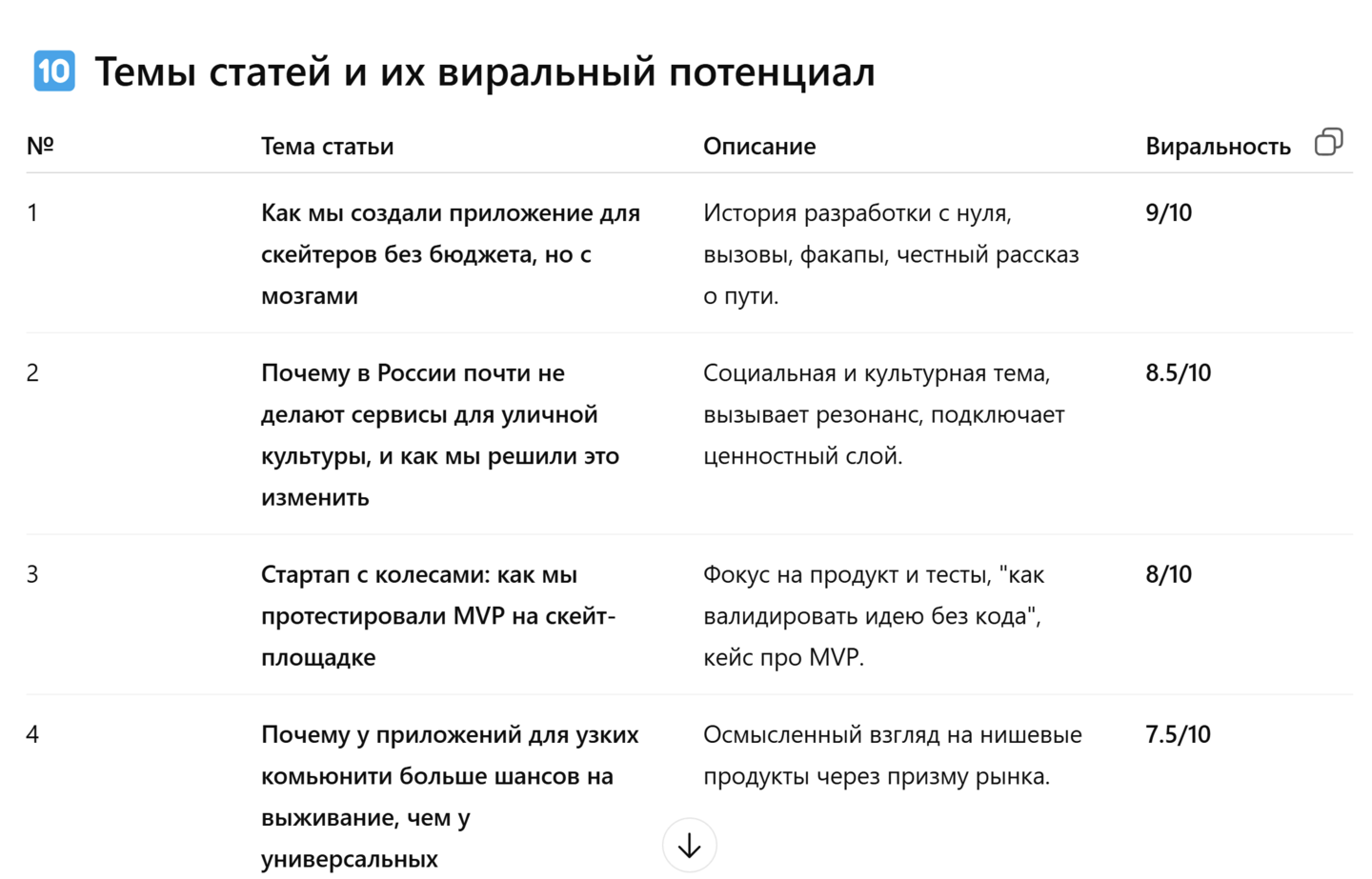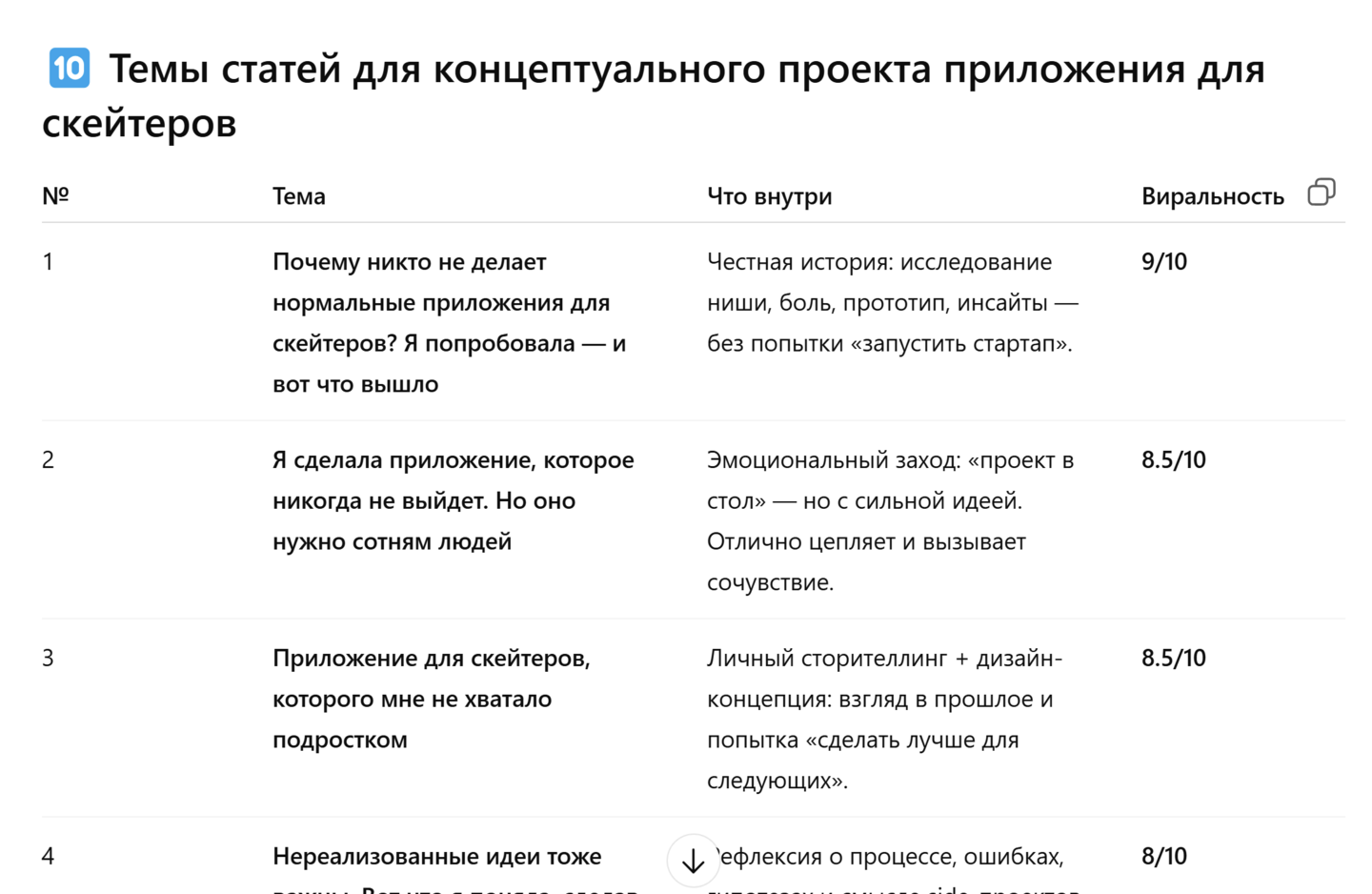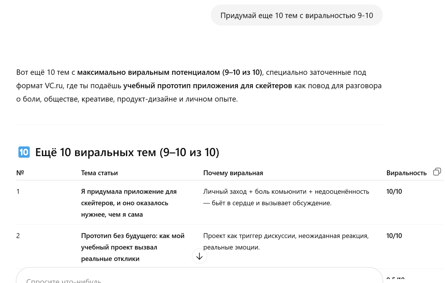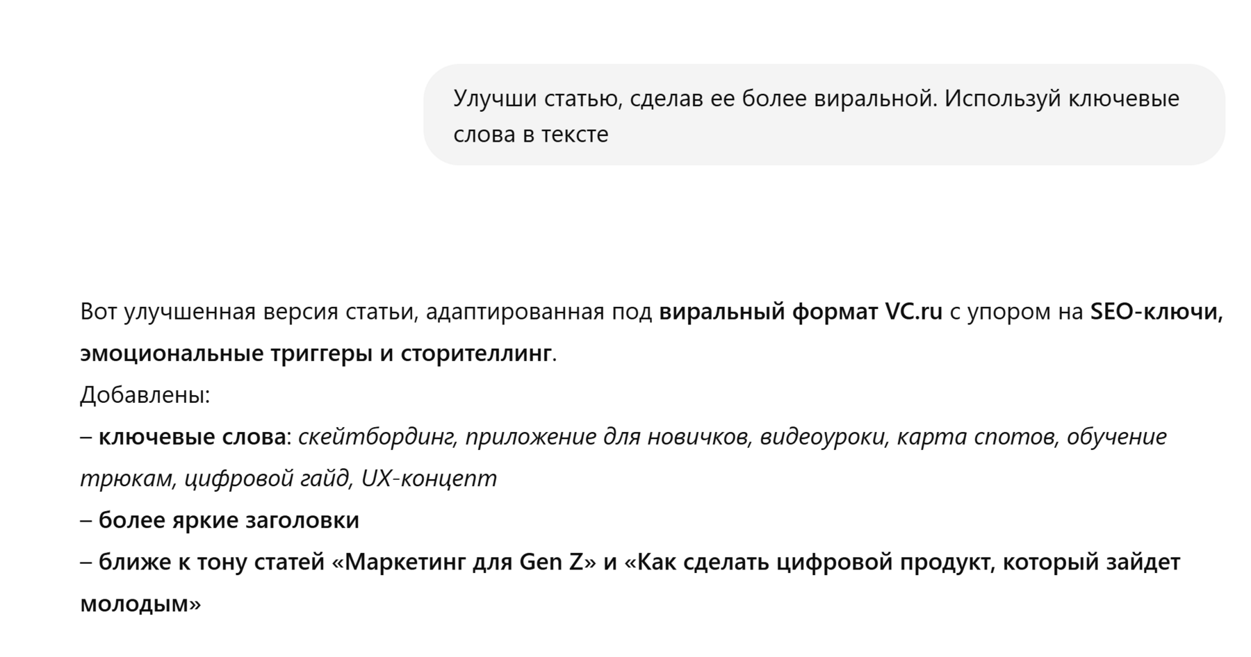 - сформулировала стратегию публикации для VC.ru; - выбрала виральную тему на основе анализа трендов платформы; - написала статью, соответствующую её Tone of Voice: без смайликов, но с честным повествованием и аналитикой; - усилила статью ключевыми словами (UX, гайд, скейтбординг, обучение трюкам).