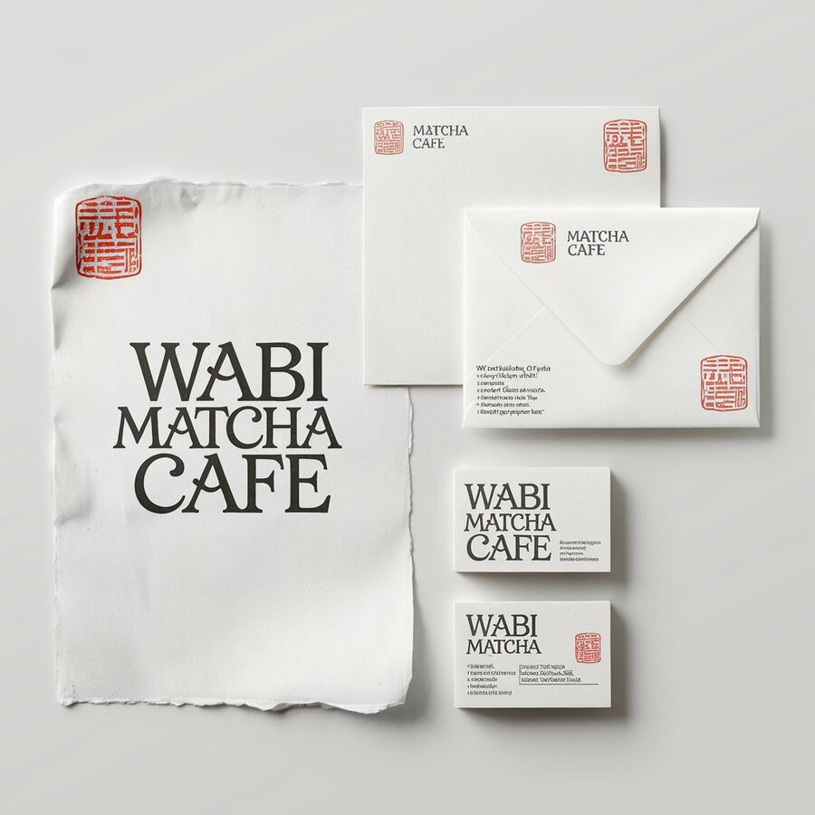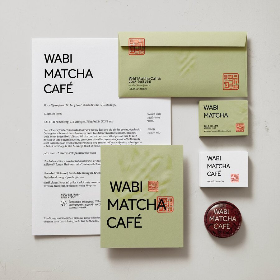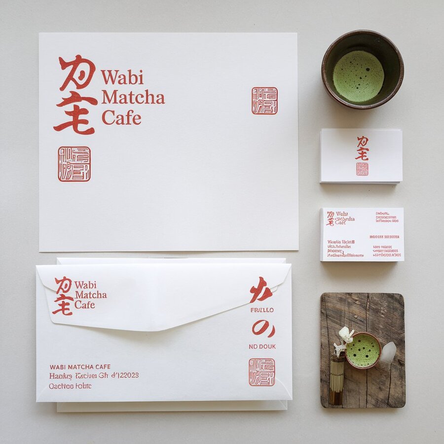 promt: generate a mockup of printed materials (paper, envelope, business cards) on a white background for WABI matcha cafe in the style of japanese red stamp hanko