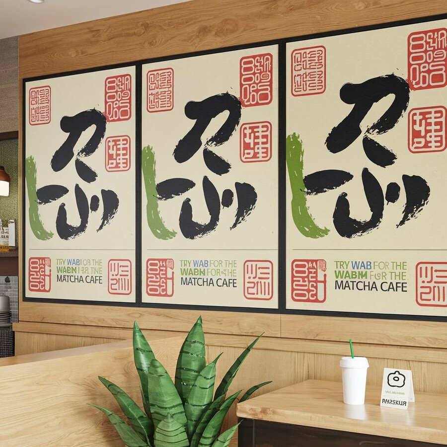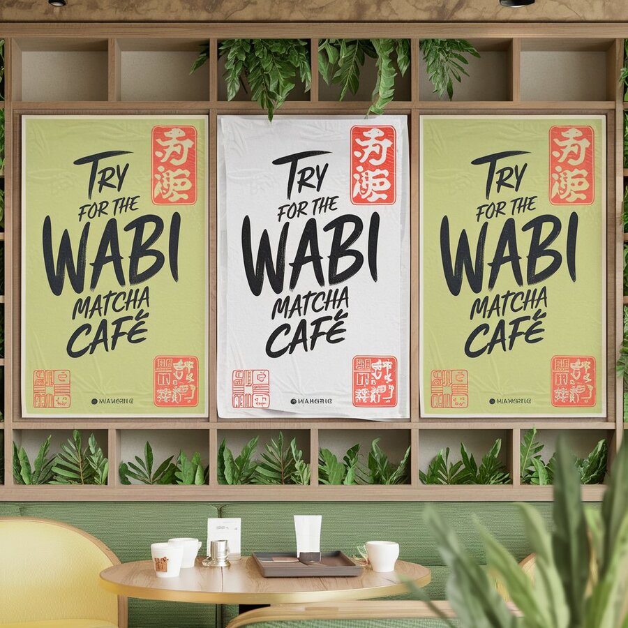 promt: mockup of 3 posters in a cafe with the inscription: try WABI for the WABI matcha cafe in the style of Japanese red stamps hanko