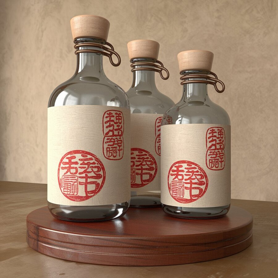 promt: make a 3D render of three glass bottles for the WABI matcha cafe in the style of Japanese red stamps hanko