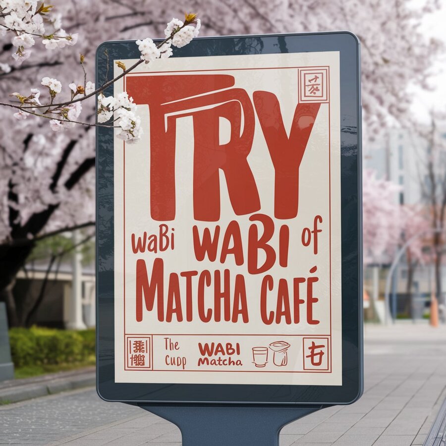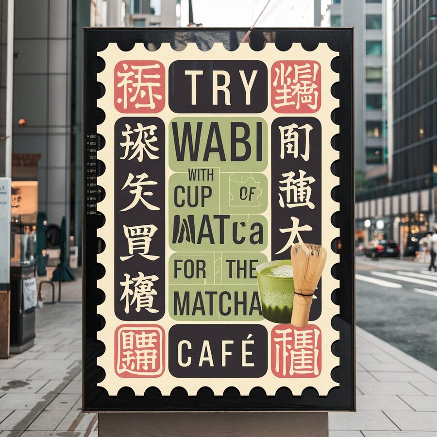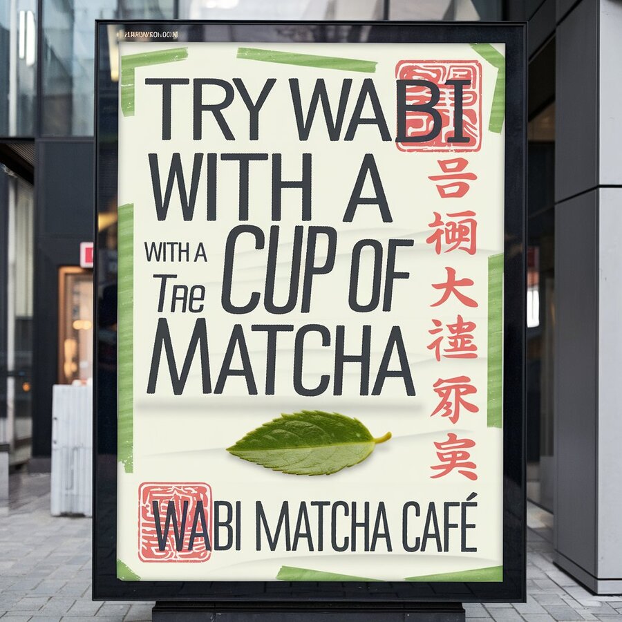 promt: mockup of urban poster with the inscription: try WABI with cup of matcha for the WABI matcha cafe in the style of Japanese red stamps hanko