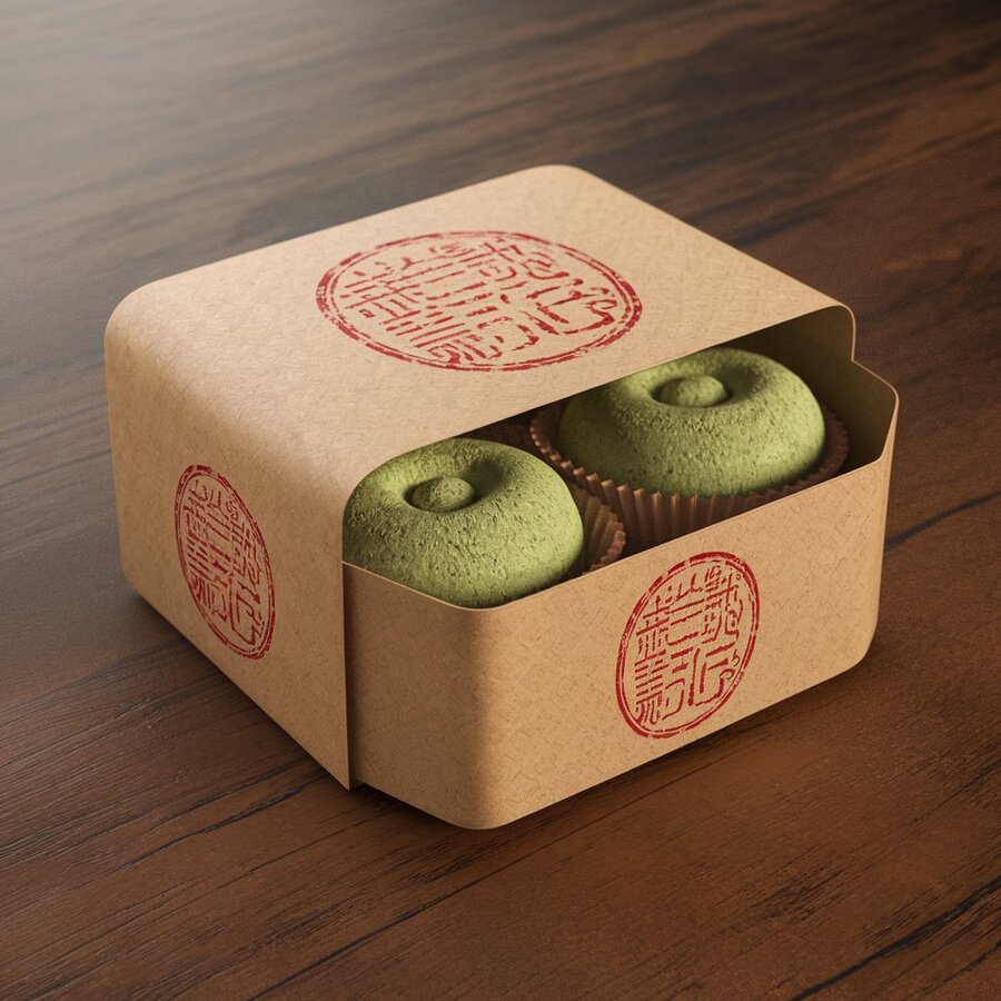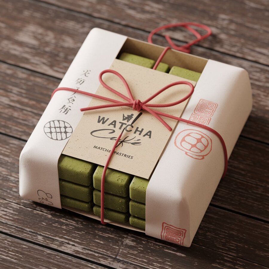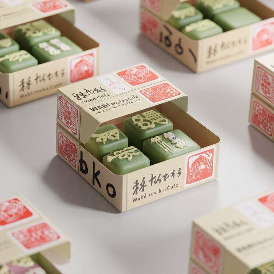 promt: make a 3D render of a craft package with pastries inside for the WABI matcha cafe in the style of Japanese red stamps hanko