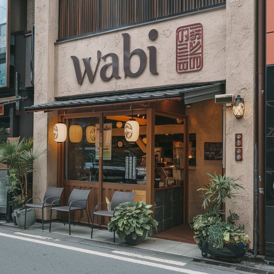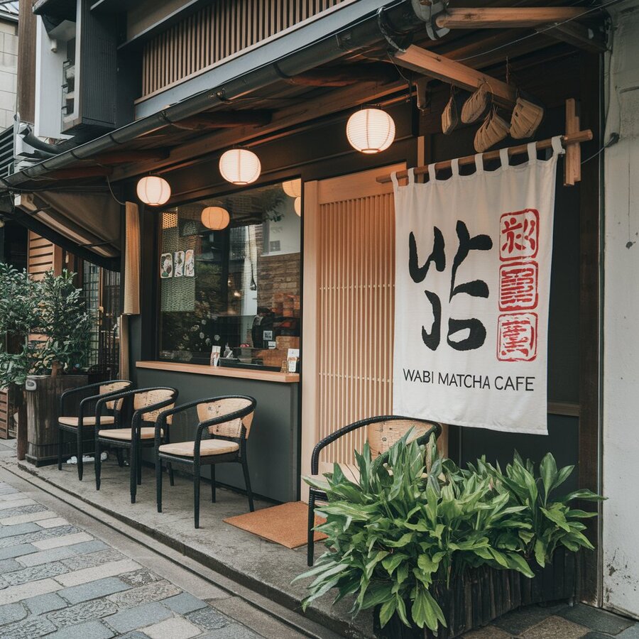 promt: A small Japanese-style cafe on the street with the WABI logo for the WABI matcha cafe in the style of Japanese red stamps hanko