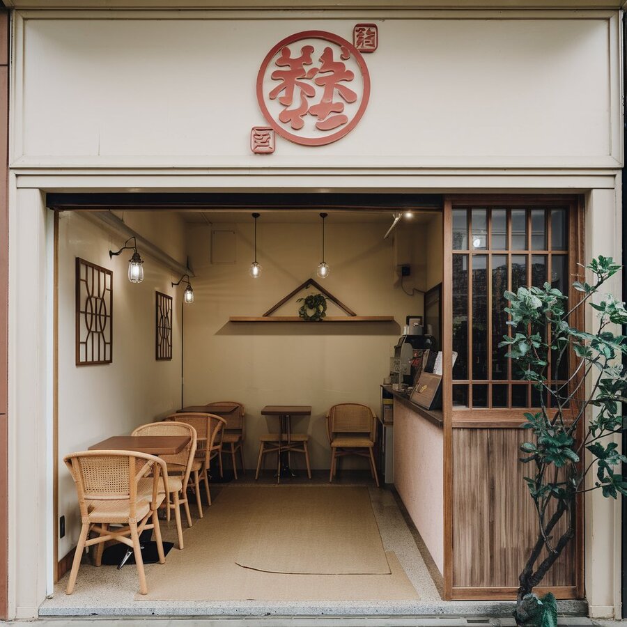 promt: the interior of a small Japanese-style cafe for the WABI matcha cafe in the style of Japanese red stamps hanko