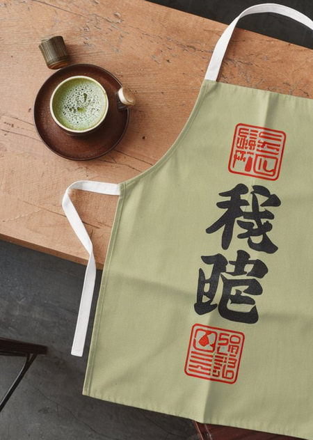 promt: make a mockup of apron on a table for the WABI matcha cafe in the style of Japanese red stamps hanko