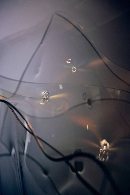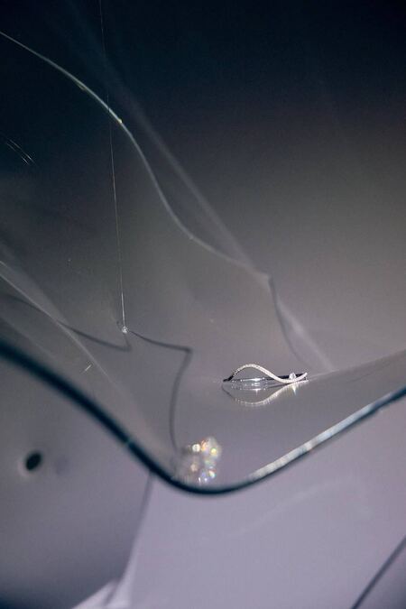Скульптура из многослойного стекла занимает центральное место в экспозиции, подчеркивая созвучие и природность элементов. Пластичное, словно речной поток, стекло, по-новому раскрывает способность бриллиантов трансформировать проходящий через них свет.