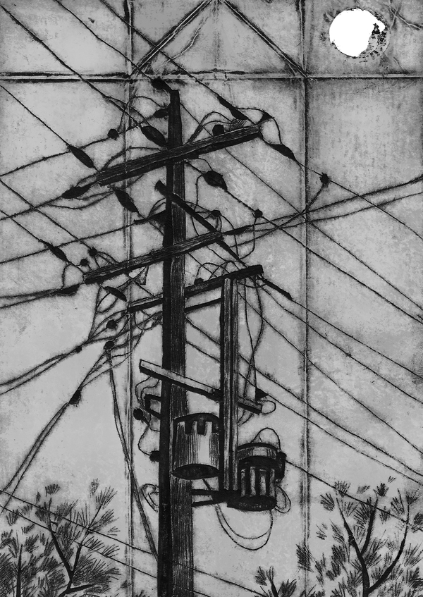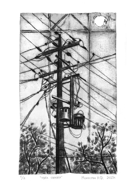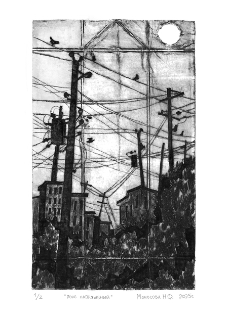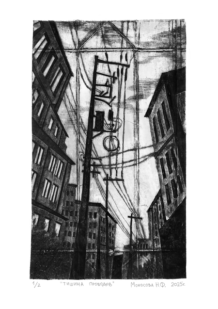 Серия гравюр в технике сухой иглы «Чёрная паутина города» — это исследование скрытой графики урбанистического пространства, где небрежные линии сухой иглы превращают хаотичную сеть коммуникаций в строгий графический узор. Благодаря технике глубокой печати с тетрапака в работах прослеживается как нервная система большого города, так и его тишина.