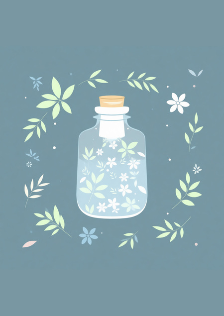 Create a brand identity based on the attached logo using a minimalist illustration of leaves and flowers in a soft, cartoonish style with pastel green and blue hues, showcasing a natural aesthetic that evokes a sense of serenity and freshness, without a brand name. The pattern reflects the natural ingredients and the quiet essence of the product.