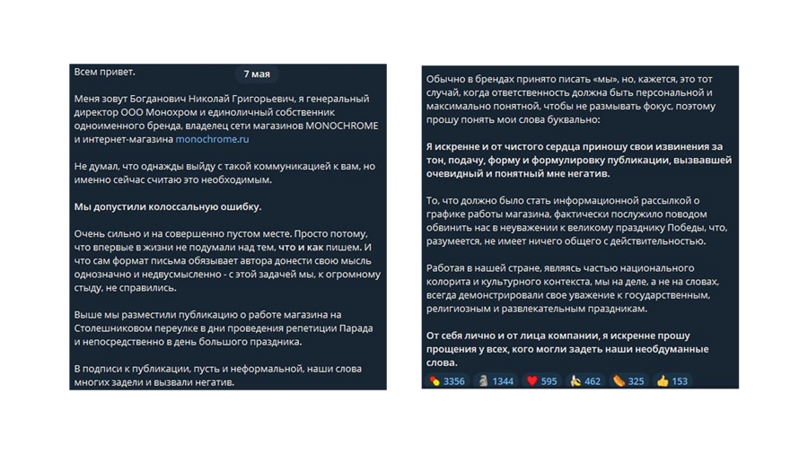 Сразу оговорюсь, что это пример не именно рекламы, а неудачного взаимодействия с аудиторией в соцсетях. 7 мая 2025 года Monochrome (бренд повседневной оверсайз одежды) в их официальном Telegram-канале выложили пост о сокращенном графике работы магазина на Большой Дмитровке в Москве в связи с проведением репетиции и самим Парадом в честь Дня Победы.