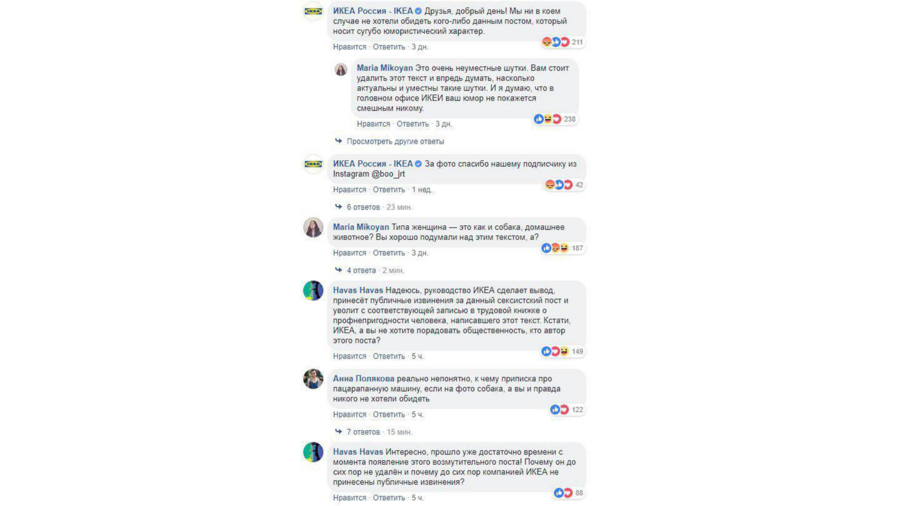 В комментариях люди спрашивали будет ли IKEA делать ролик про матерей или детей, которым тоже может не хватать личного пространства. «Ох уж эти бабы, которые затюкали мужика! Однако, чаю заботливо принесут, это мы знаем, это норма. А женщинам — никто не принесет. А женщинам — даже думать про личное пространство не приходится», — пишет nzl7. Бренд также обвинили в обесценивании вклада матерей, которые в первые годы жизни детей личного пространства вообще не имеют.