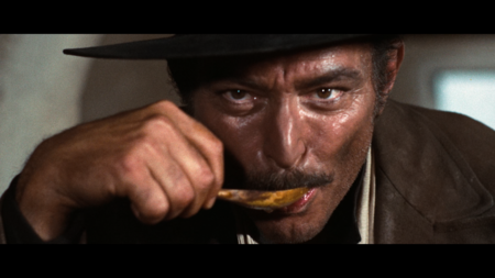 Сближение с глазами актера в культовой сцене мексиканской дуэли модулирует саспенс и заигрывает с симпатиями зрителей.