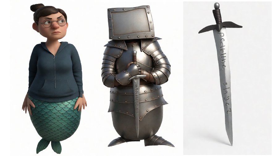 Смесь реальности и эстетик: вызов выходу из зоны комфорта. (Рыцарь с головой телевизором/офисная работница русалка/меч «Deadline slayer») (Серебристая нейтральная краска)