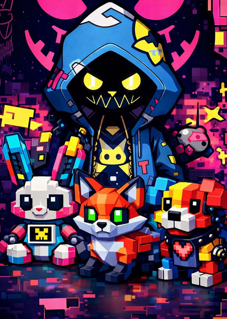 Концепция «Кибер-зоопарк: Пиксельные питомцы» — это идеальный баланс между милотой, ностальгией, необычной гранёной эстетикой и конкретикой. Каждый объект серии имеет чёткую тему (глитч, конструктор, дисплей, лаг), что делает коллекцию разнообразной и глубокой для целевой аудитории.
