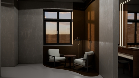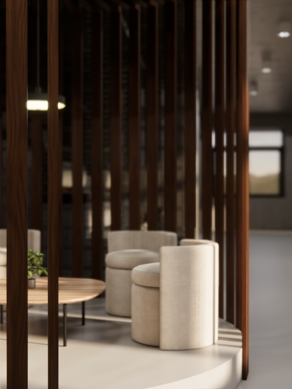 Стены кураторской сделаны из рельефного, закругленного стекла, что бы туда проходил свет и было ощущение пространства