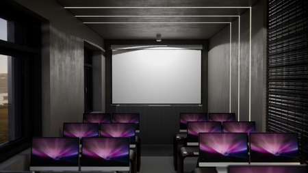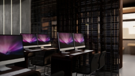 Стена компьютерного класса сделана из черных стеклоблоков, что визуально расширяет пространство и добавляет свет