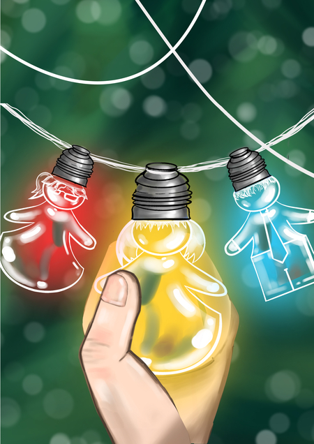 Новогодняя ёлка, как и жизнь будущих приёмных родителей — абсолютно полноценное явление, однако, яркая гирлянда дополняет её и превращает обычный будний день в настоящий праздник! Лампочки на гирлянде представляют собой фигурки самих родителей и долгожданного ребёнка.
