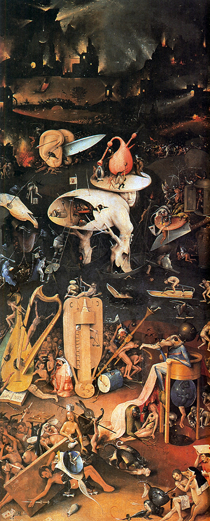 Правая створка — ад, где грешники испытывают вечные муки за свои пороки. Босх подчеркивает неизбежность расплаты за земные наслаждения. Художник использует образы музыкальных инструментов, которые приобретают угрожающий вид и становятся орудием пытки, символизируя дьявольское влияние на человеческие пороки.