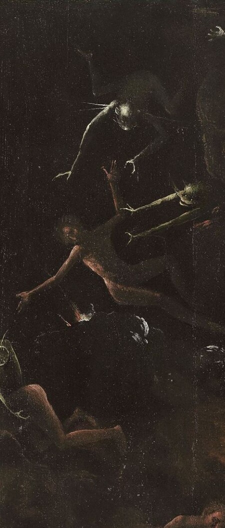 В правой панели триптиха «Блаженные и проклятые» изображено падение грешников в ад. Мрачные тона и темный, хаотичный фон усиливают ощущение отчуждения и пустоты, которые сопровождают души, отвергнувшие высшие ценности. Падение в пустоту можно рассматривать как метафору духовного упадка, символизирующую вечное отделение от божественного, где грешники навсегда теряют связь с источником света и гармонии.