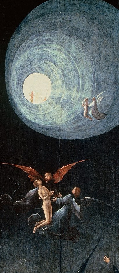 изображены души, возносящиеся к свету через туннель, символизирующий путь к Богу и спасению. Свет в конце туннеля выступает как надежда на спасение и освобождение от земных страданий. Фигуры ангелов, помогающих душам, подчёркивают идею искупления, где божественная помощь и вера ведут к духовному преображению. Контраст светлого и тёмного фонов создаёт ощущение перехода из мира материального в вечное духовное царство.