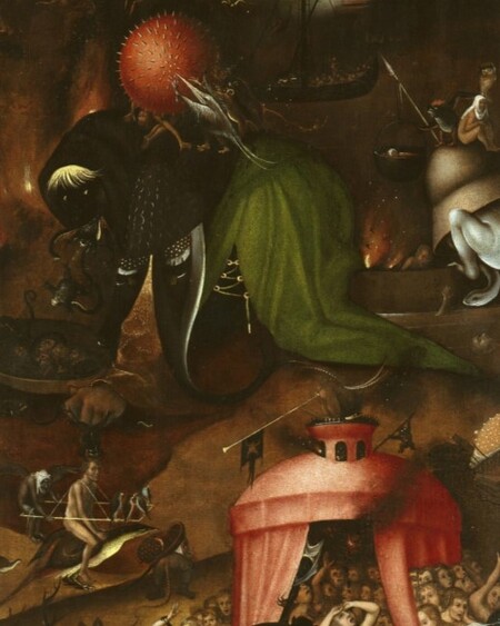 Триптих «Страшный суд» наполнен фантастическими существами, которые воплощают вечные муки и пороки, караемые в аду. В правой части картины изображены гибридные демонические существа, созданные из элементов животных, людей и неодушевленных объектов. Эти образы чудовищ, совершающих жестокие действия над грешниками, символизируют внутренние страхи и мучения, ожидающие души в загробной жизни.