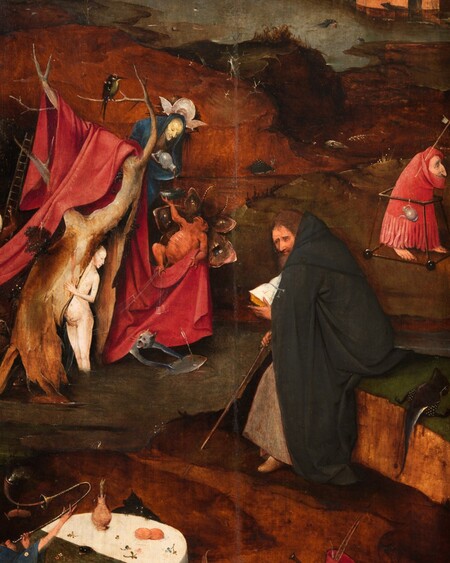 Триптих «Искушение святого Антония» изображает духовную борьбу святого Антония, окружённого демоническими существами и сценами хаоса. Центральная панель символизирует искушения земного мира, где фантастические существа воплощают материальные и плотские соблазны, стремясь отвлечь человека от духовного пути.