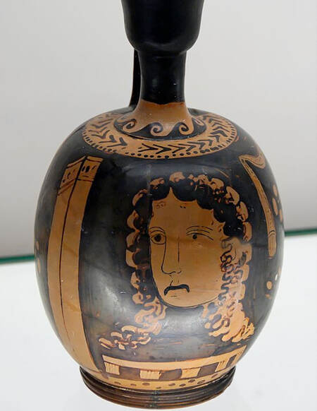 Изображение трагической маски на краснофигурном лекифе Вазописца Примато. «Маска Агамемнона», XVI века до н. э.