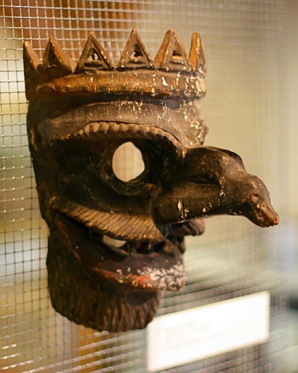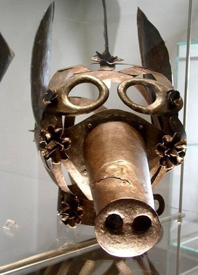 Эта маска была обнаружена в стене каменного здания недалеко от Давентри в Нортгемптоншире, где пролежала более четырех веков. Вместе с ней нашли стеклянный шарик, который прикреплялся к отверстию для рта, позволяя даме держать маску на лице, не используя видимые ремни. Если женщина хотела поговорить, ей нужно было снять маску. Использование таких масок делало дам молчаливыми, что воспринималось как элемент загадочности в их характере.
