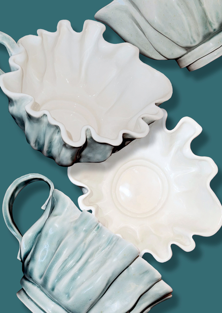 Чашки словно дышат — их текучие, органичные линии напоминают движения воды и драпировку лепестков, создавая ощущение легкости и гармонии. Мягкие, естественные цвета, варьирующиеся от нежных голубовато-серых до глубоких морских оттенков, усиливают эту связь с природными стихиями.
