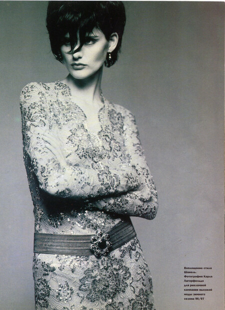 Модель Стелла Теннант. Рекламная кампания коллекции CHANEL Prêt-à-Porter Осень-Зима 1996/1997. фотограф Карл Лагерфельд. Marie Claire Germany 1996