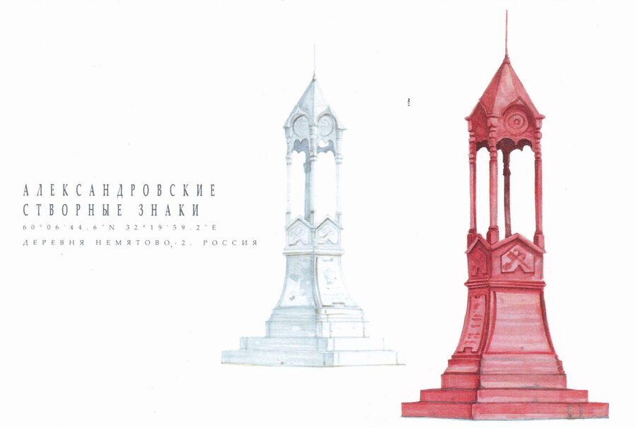 Чугунные створные знаки установлены в 1880 г. по обеим сторонам Новоладожского канала на выходе из реки Волхов. Названы Александровскими по имени императора Александра II, в правление которого постороены. В период активного судоходства по каналу, внутри знаков зажигался огонь.