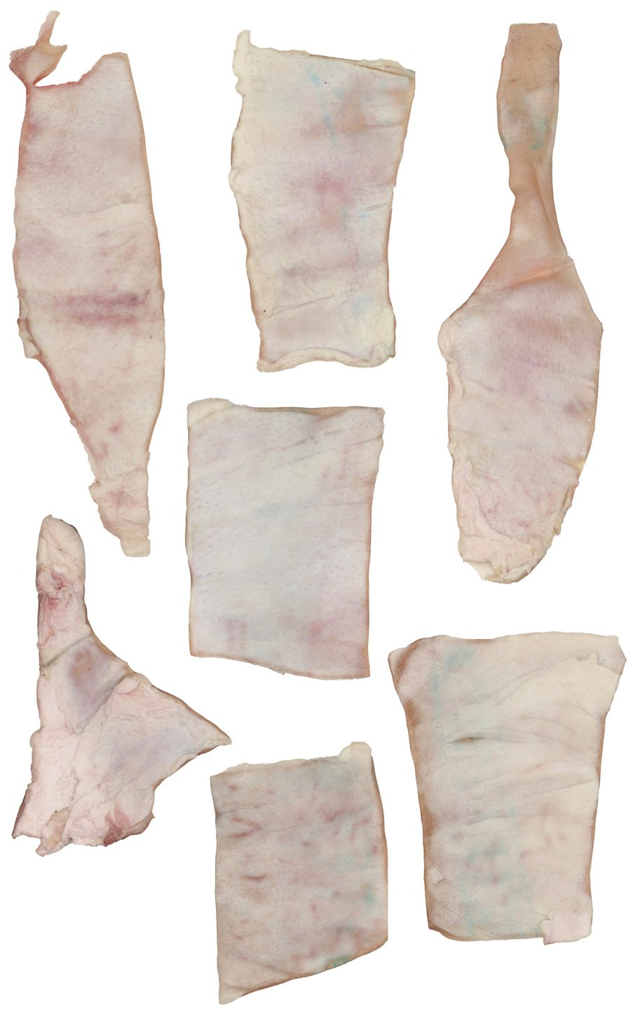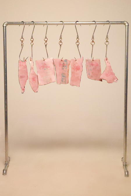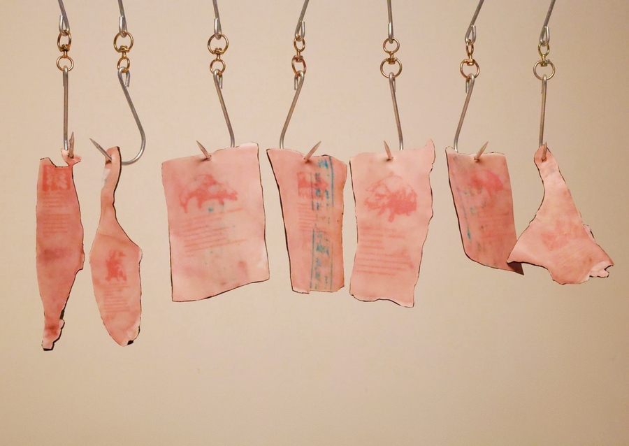This installation employs synthetic pigskin with matte-finish coating to simulate biological sebum residue, interrogating the cultural devaluation of physiological processes. The transposed metaphor between menstrual blood and animal byproducts reveals a shared fate: both are reduced to «secretions demanding erasure» within anthropocentric hierarchies.