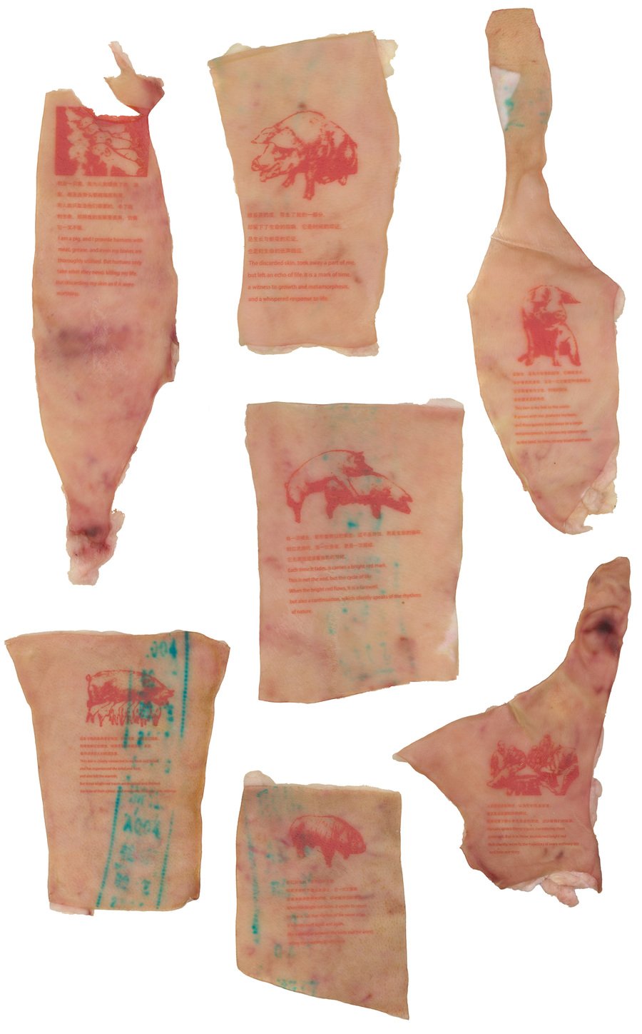 七张皮革以渐进褪色工艺记录猪的生命周期,表面肌理刻意保留哑光油渍效果,迫使观者直视文明规训下的「洁净」伪逻辑。悬挂装置挪用屠宰场的空间语法,揭露人类对生命物质的双重标准:崇拜生命却否定其代谢过程。