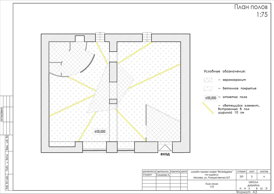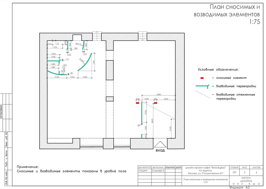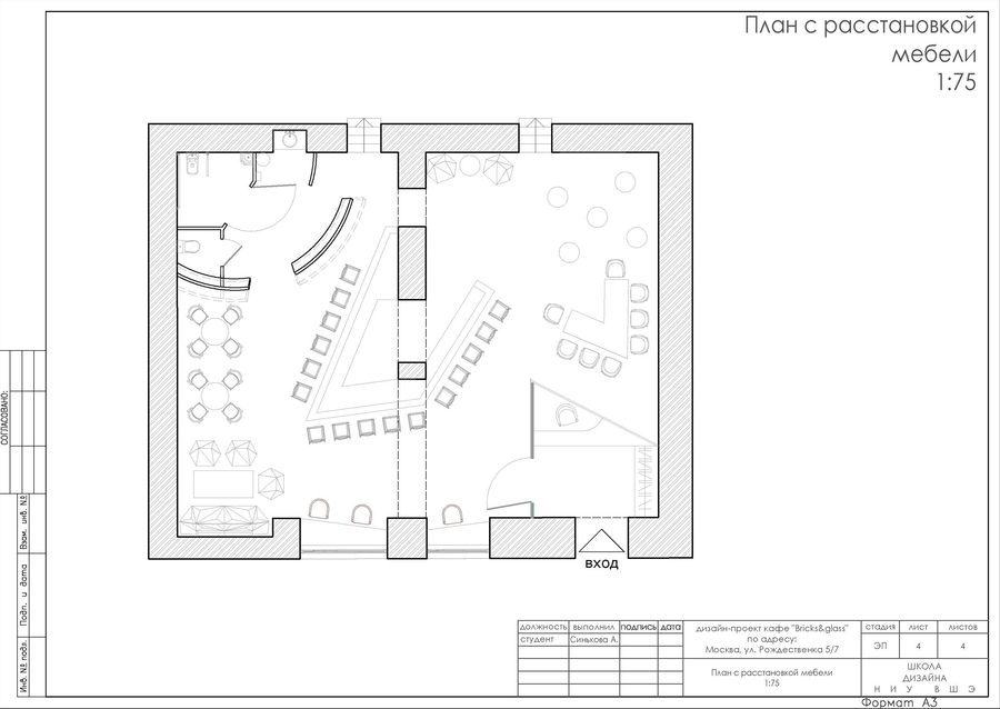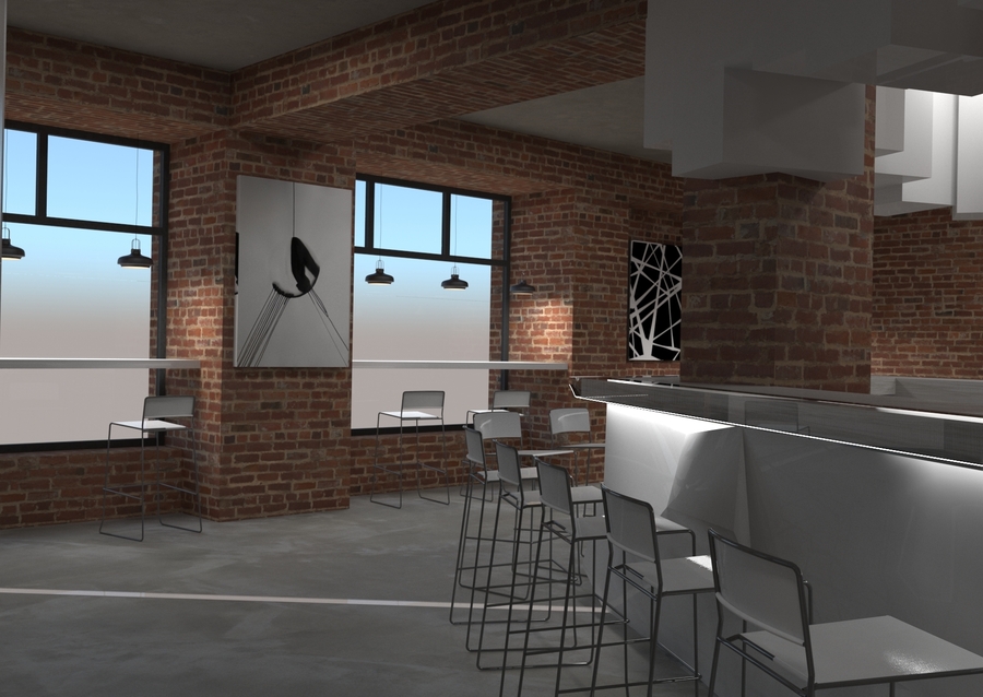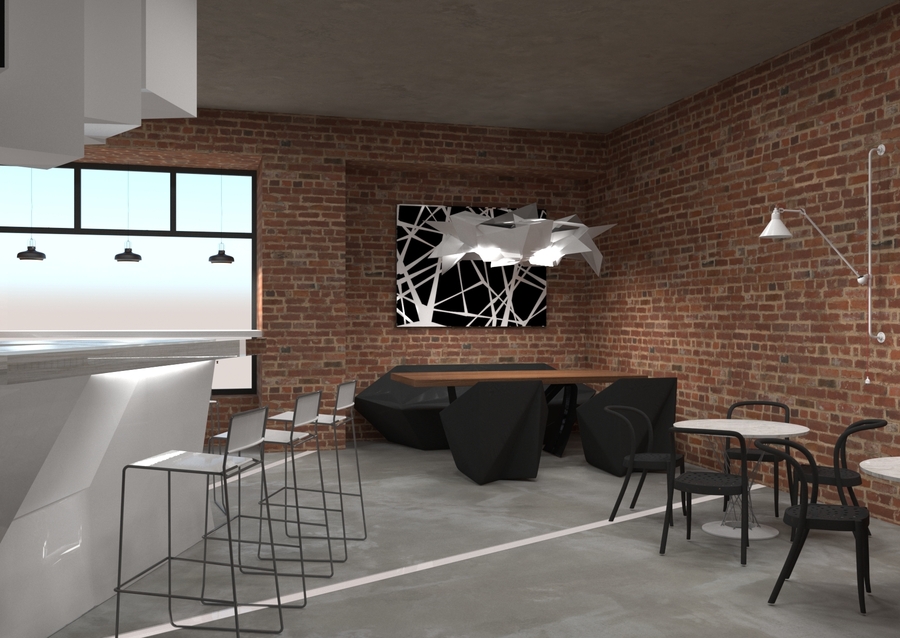 Арт-пространство «Bricks& glass», на создание интерьера которого вдохновил Daniel Libeskind, разделено на зоны и ориентировано на молодых людей, для каждого из которых найдется удобное место: днём можно зайти пообедать, провести пару собеседований за общим столом или уединиться у окна с ноутбуком. Вечером же пространство можно арендовать под закрытый показ работ или коктейльную вечеринку.