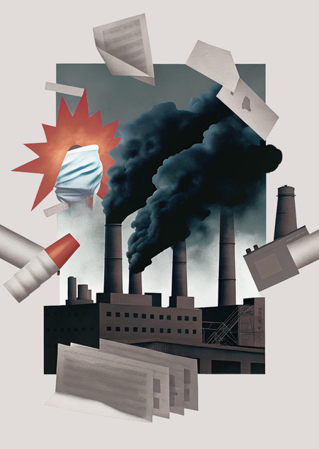 В качестве цветового решения было выбрано несколько цветов в приглушенной серовато-коричневой гамме. Данная палитра ассоциируется с загрязнением, но цвета достаточные светлые, так как речь идет о воздухе, который сам по себе делает цвета менее насыщенными. Для акцентных элементов я использовала оранжево красный, чтобы подчеркнуть опасность данной проблемы и не вводить зрителя в заблуждение нейтральными оттенками.